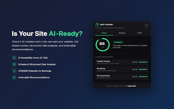 GEO Checker เป็นส่วนขยาย Chrome ฟรีที่ออกแบบมาเพื่อเพิ่มความสามารถในการมองเห็นของหน้าเว็บในเครื่องมือค้นหา AI เครื่องมือนี้เชี่ยวชาญในการวิเคราะห์หน้าเว็บสำหรับการเพิ่มประสิทธิภาพเครื่องยนต์สร้างสรรค์ (GEO) เพื่อให้แน่ใจว่าคอนเทนต์ของคุณสามารถค้นพบได้ง่ายโดยเทคโนโลยี AI เช่น ChatGPT และ Perplexity ด้วยการคลิกเพียงครั้งเดียว ผู้ใช้สามารถประเมินความสามารถในการถูกเก็บข้อมูลของ HTML ของตน ประเมินประสิทธิภาพของ Schema.org markup ของตน และได้รับข้อมูลเชิงลึกเกี่ยวกับข้อมูลที่มีโครงสร้างของตน